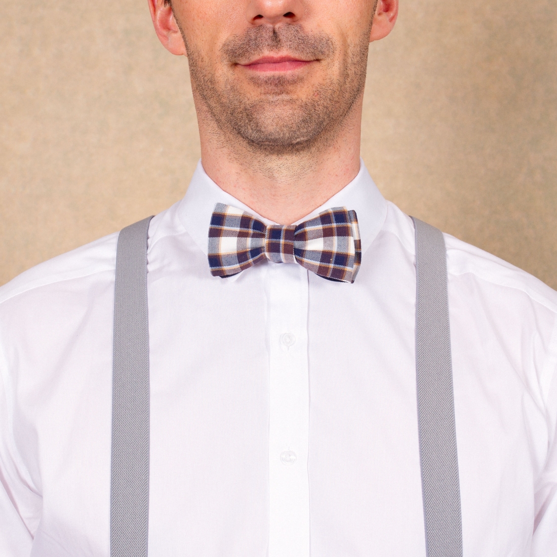 This bow tie features a plaid pattern in shades of blue, brown, and white, evoking a classic and timeless style. The checks are symmetrical and well-defined, adding an element of elegance to the design. The different shades of blue blend harmoniously with the brown and white tones, creating a visually pleasing balance. This type of pattern is versatile and can be worn for various occasions, whether formal or casual. It is ideal for those looking to add a touch of traditional sophistication to their outfit.