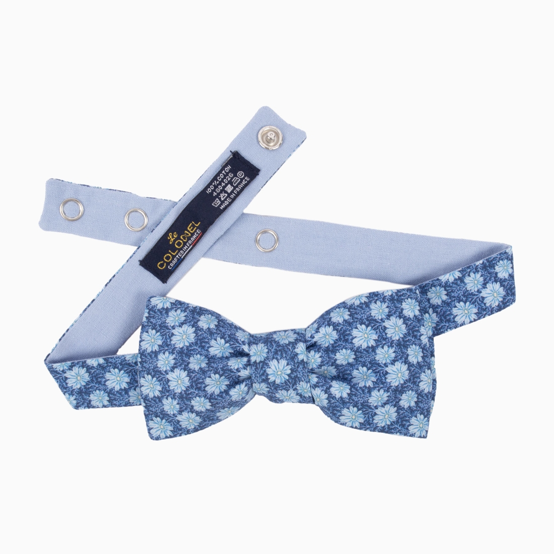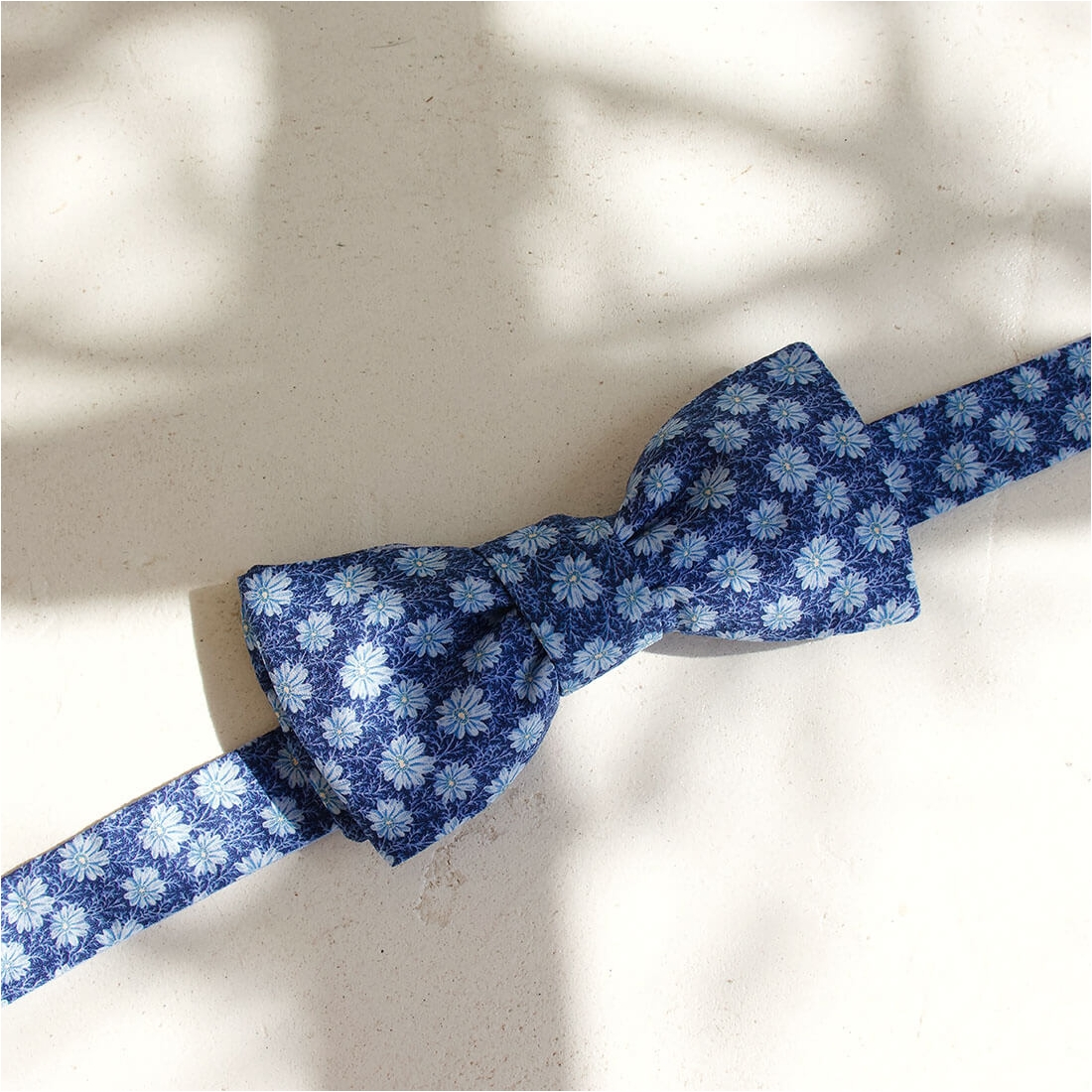 Reinvigorate your accessory collection with the Peter Periwinkle bow tie. This bow tie is crafted from a fabric featuring a subtle floral pattern, where sapphire blue florets with golden hearts shine against a deep blue background. Whether for a wedding, a gala evening, or to elevate your everyday work suit, this bow tie is synonymous with timeless elegance. With its deep blue hues and bright touches of gold, it embodies a sophisticated style and effortless refinement, ideal for the modern man seeking a touch of nobility in his attire.