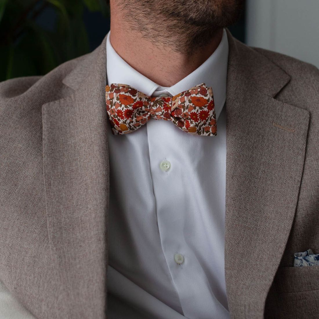 Add a touch of vintage elegance to your outfit with the Liberty Poppy squirrel bow tie. Its refined floral pattern blends warm shades of red, brick, ochre and green on an ecru background, evoking the charm of timeless prints. Carefully crafted from Liberty of London fabric, this bow tie has a delicate, authentic feel. Ideal for a special occasion or to enhance an everyday outfit, it goes perfectly with a light-coloured shirt and a sober suit. A distinguished accessory for style lovers