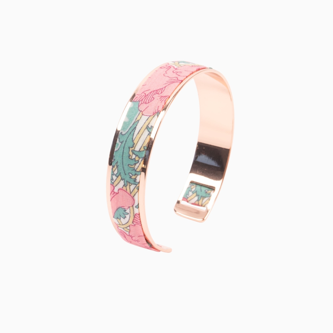 This rose gold brass cuff is adorned with a charming floral pattern, featuring a mix of pink, teal, and green hues for a vibrant, eye-catching look. The open cuff design allows for an adjustable fit, while the floral print adds a feminine touch to the polished metal. It's a perfect blend of nature-inspired beauty and modern style.