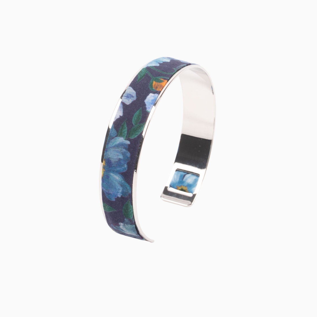 This silver-plated brass bracelet is distinguished by its artistic coating, which features a field of vibrant turquoise blue flowers against a deep navy blue background. The effect is that of a starry night sky with eye-catching splashes of vibrant colour. The silver finish of the bracelet offers a subtle shine that highlights the floral motif and adds a touch of elegance. The open, adjustable design ensures comfortable wear for different wrist sizes. This bracelet is a wonderful combination of art and accessory, making it perfect for those looking to add a touch of colour and originality to their wardrobe.