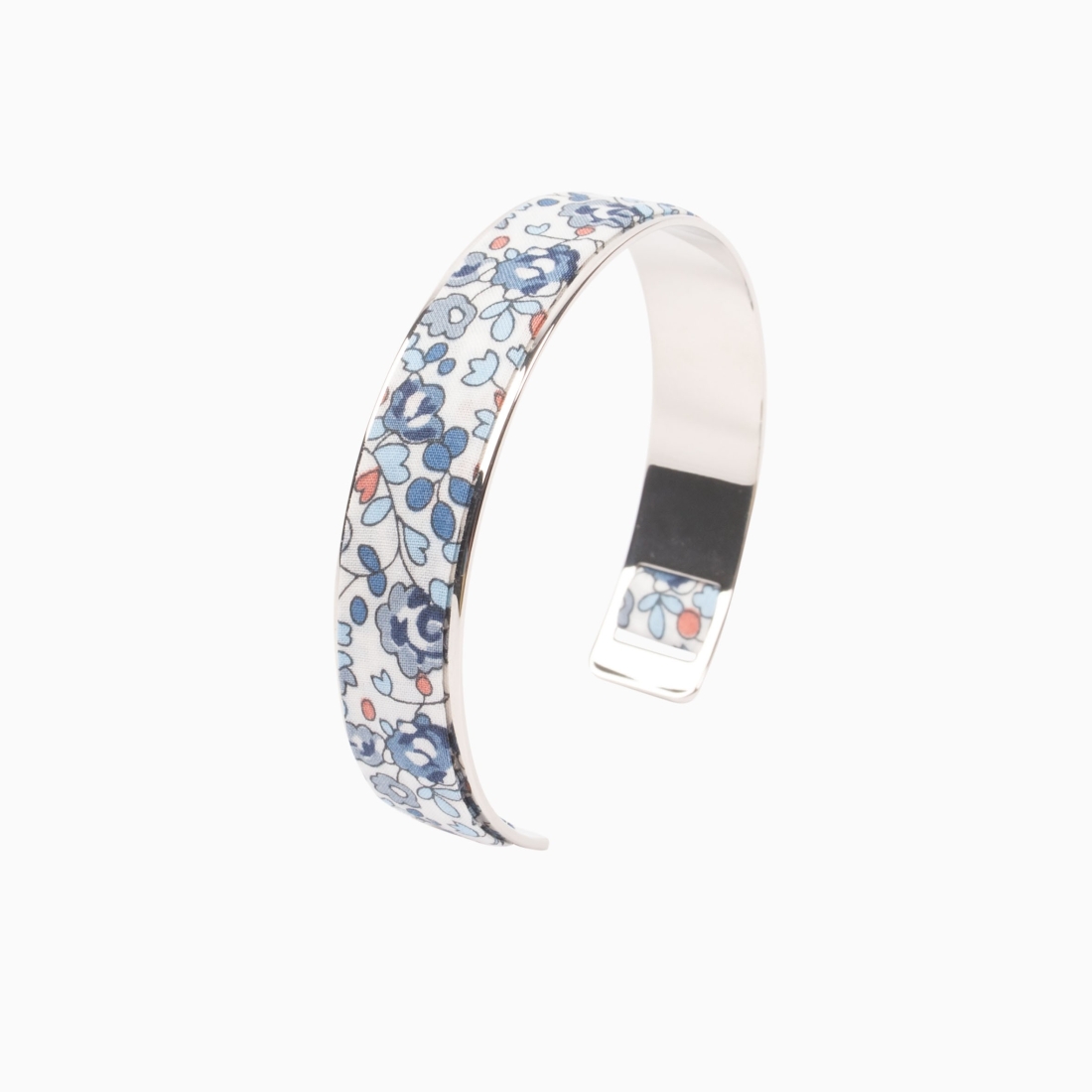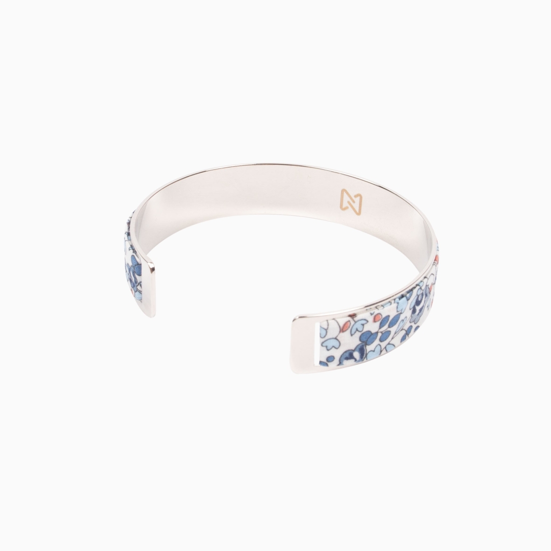 The silver-plated brass bracelet features a richly coloured floral motif with a predominance of blue. The flowers, evenly distributed throughout the bracelet, combine lighter and darker shades of blue, creating a dynamic and eye-catching visual effect. The light background of the motif brings out the bright colours of the flowers, providing a delicate, feminine contrast. The silver-tone metal part of the bracelet adds a touch of sparkle and sophistication. With its open design, it is easy to put on and adjust, making it as practical as it is elegant. This bracelet is ideal for those who appreciate accessories that combine traditional craftsmanship with contemporary style.
