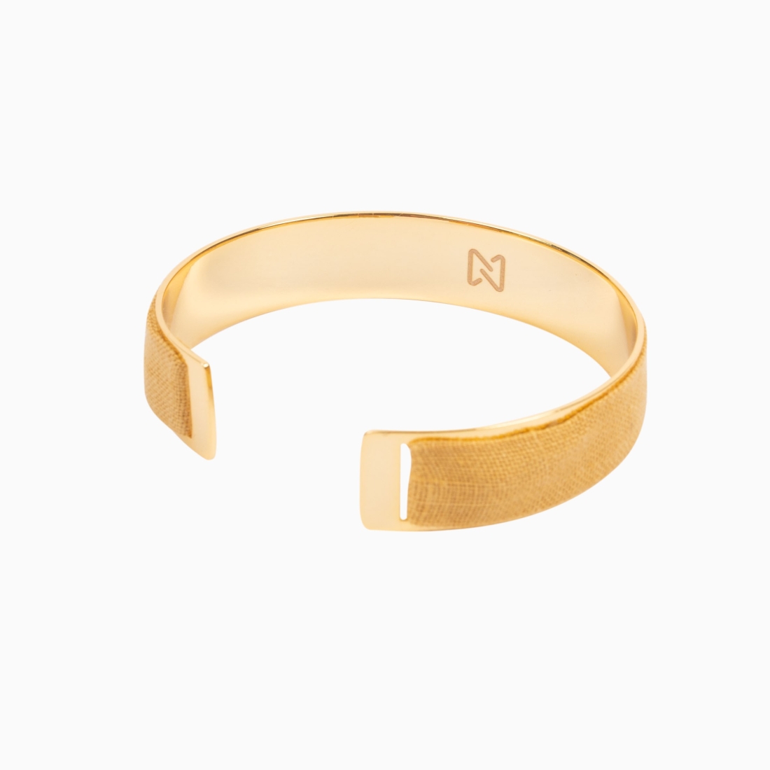 This striking gold brass cuff is elegantly paired with mustard linen, providing a rich texture and a pop of color. The linen's natural weave offers a rustic yet refined look, while the golden shine of the cuff adds a touch of glamour. Perfect for both casual and formal settings, this bracelet is a stylish testament to the beauty of combining traditional fabrics with metallic finishes.