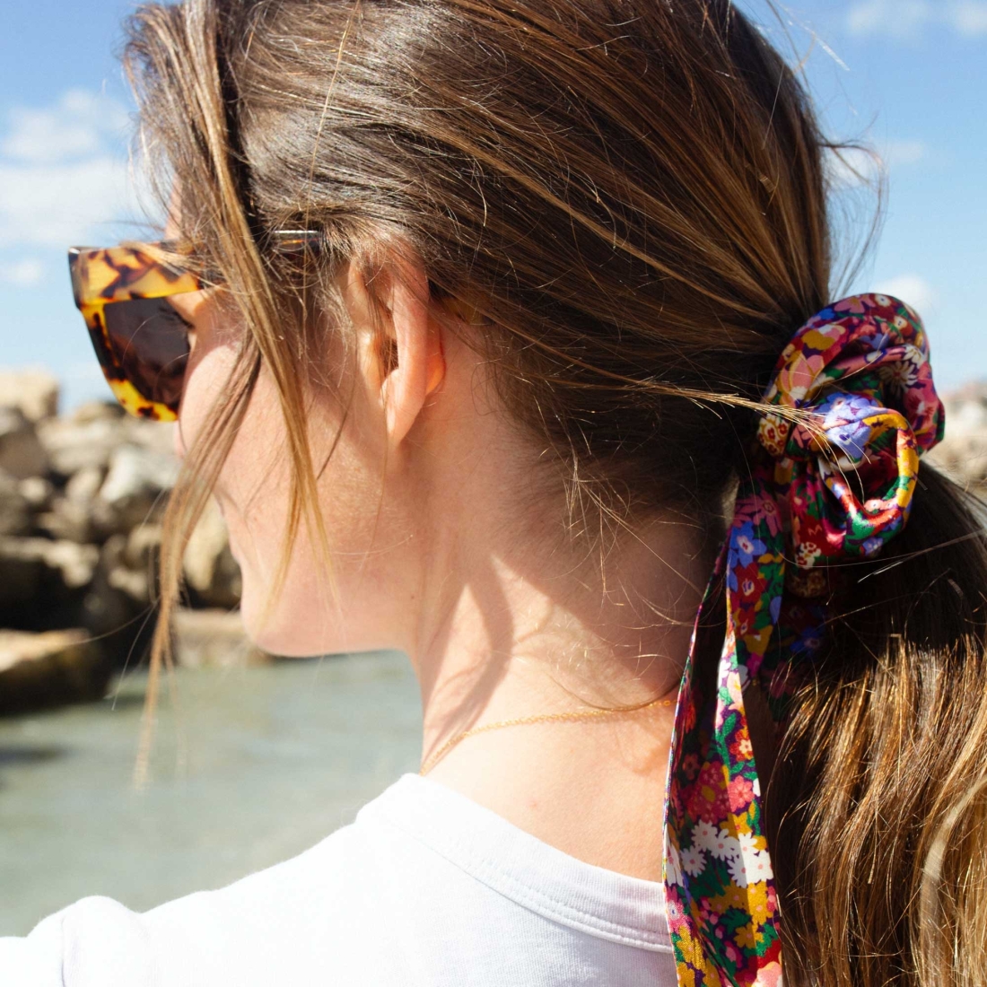 This silk foulchie stands out with its exuberant floral pattern, bursting with an array of vibrant and warm colors. Flowers of various species intermingle in a palette ranging from scarlet red to sunshine yellow, with touches of blue and green, creating an impression of a wild and lush bouquet. Silk, a noble and delicate material, adds a touch of luxury to the accessory while ensuring a soft and comfortable hold in the hair. The foulchie's long ends drape elegantly, allowing you to play with styles for a sophisticated yet joyfully colorful look.