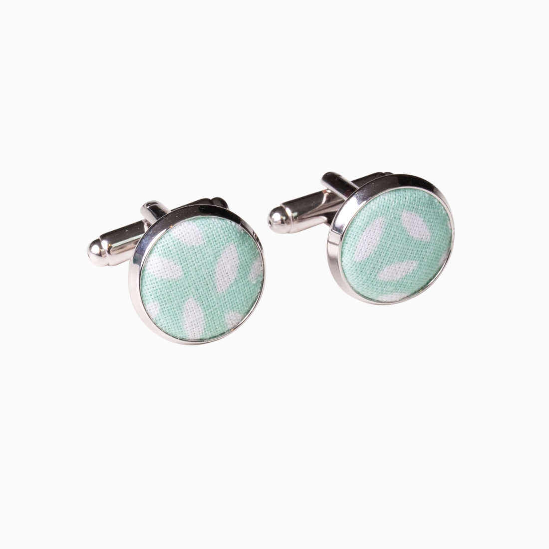 These cufflinks feature a subtle and elegant pattern that appears to represent a rice grain motif on a coconut-colored background, which is a soft aqua green hue. The pattern in question creates a subtle texture and a visual effect that adds depth to the design. They appear to be designed to add a discreet touch of sophistication to a formal or professional outfit. The combination of color and pattern offers a refined alternative to more traditional cufflinks.
