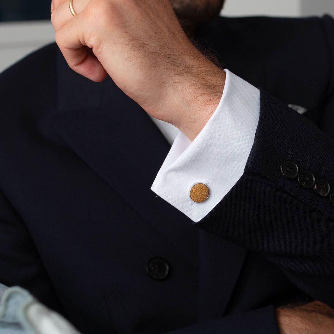 The mustard linen cufflinks are the perfect accessory for the man looking to combine originality and sophistication. This mustard shade, both warm and rich, adds a touch of boldness and distinctive charm. Made of linen, these cufflinks have a pleasant and natural texture, providing an interesting contrast to more traditional fabrics. Ideal for elevating a plain suit or injecting a pop of color into a formal ensemble, they pair beautifully with a variety of colors and styles. The mustard linen cufflinks are an excellent choice for those who want to express their personality while maintaining timeless elegance.