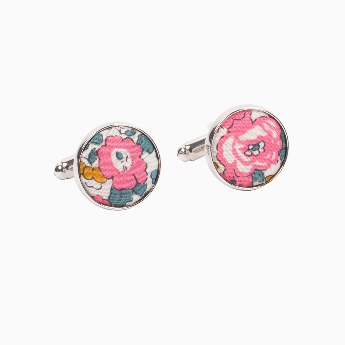 These cufflinks feature bold and vibrant pink flowers on a contrasting background, creating a modern and cheerful aesthetic. The main flower is accentuated with touches of yellow, black, and blue, adding an extra dimension to the overall design. They are perfect for those looking to inject a touch of bright color and joyful expression into their formal wardrobe. The striking design would also make a memorable gift for someone who appreciates accessories that stand out and add a personal touch to their style.