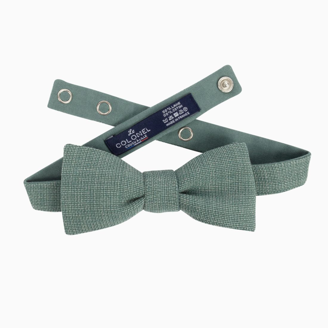 The origano green bowtie is the essential splash of color for outdoor ceremonies. Its aromatic green shade, both soft and deep, catches the natural light, while the relief of its wool weave adds that extra touch of soul and structure. Forget basic greens: here, the texture plays with color for a fresh, modern, and relaxed wedding look