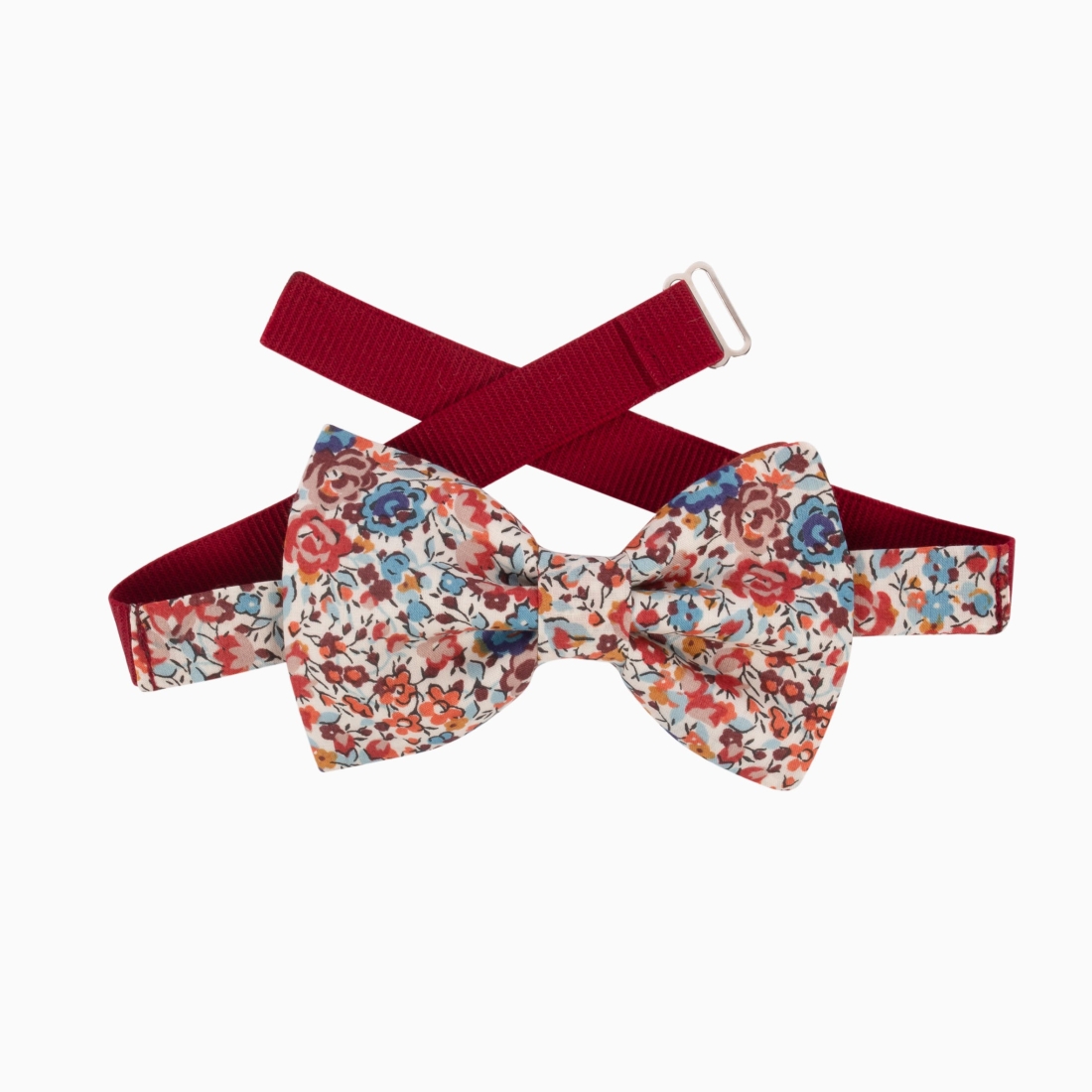Bring a touch of color and liveliness to your child's outfit with this beautiful Liberty Emma Brick bow tie from Le Colonel. Made in France, this bow tie features a vibrant floral pattern with flowers in shades of brick red, blue, and orange on a white background. This elegant and cheerful design is perfect for special occasions or to add a joyful note to an everyday outfit. An ideal accessory for children who want to stand out with style and originality.