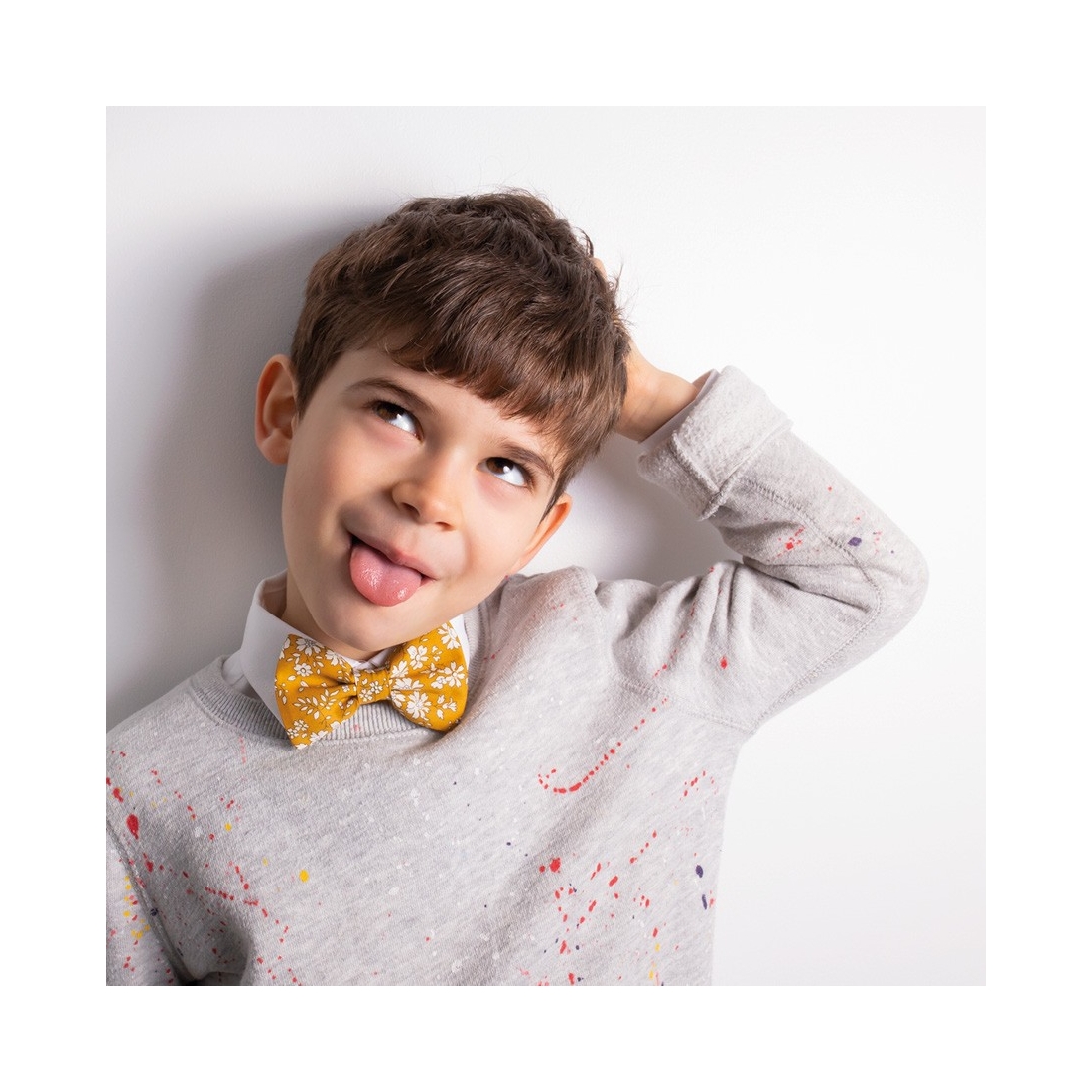Add a touch of warmth and elegance to your child's outfit with this beautiful Liberty Capel Mustard bow tie from Le Colonel. Made in France, this bow tie features a delicate floral pattern with white flowers on a mustard yellow background. This elegant and refined design is perfect for special occasions or to bring a touch of color to an everyday outfit. An ideal accessory for children who want to stand out with style and elegance.