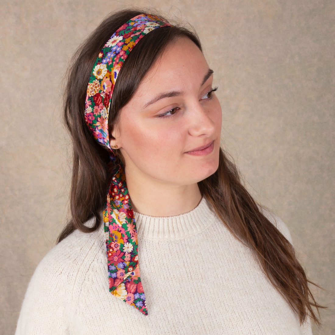 This scarf showcases a vibrant and colorful floral pattern that adds a lively touch to the wearer's appearance. The rich palette and the density of the flowers provide a playful yet fashionable look. This scarf, affectionately named Lili, is exceptionally versatile. It can be stylishly tied around the handle of a bag, bringing a burst of color and personality to an everyday item. When worn around the neck, it can serve as a centerpiece, attracting attention and complementing the outfit. Alternatively, when tied around the waist as a belt, it can cinch in clothing for a more defined silhouette. Whether used as a hair accessory, a bag charm, a neck scarf, or a belt, the Lili scarf is an adaptable item that can enhance a range of looks.