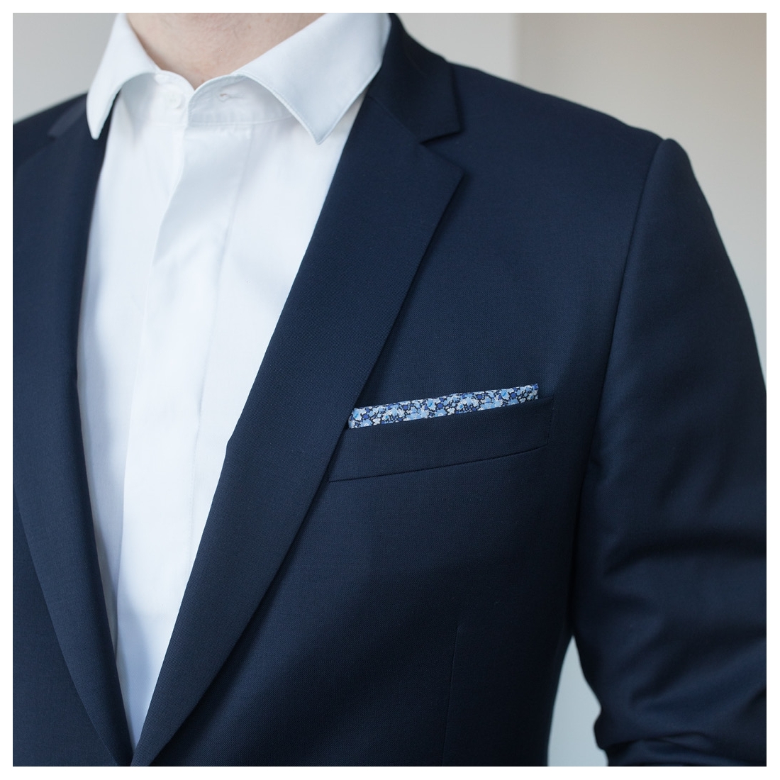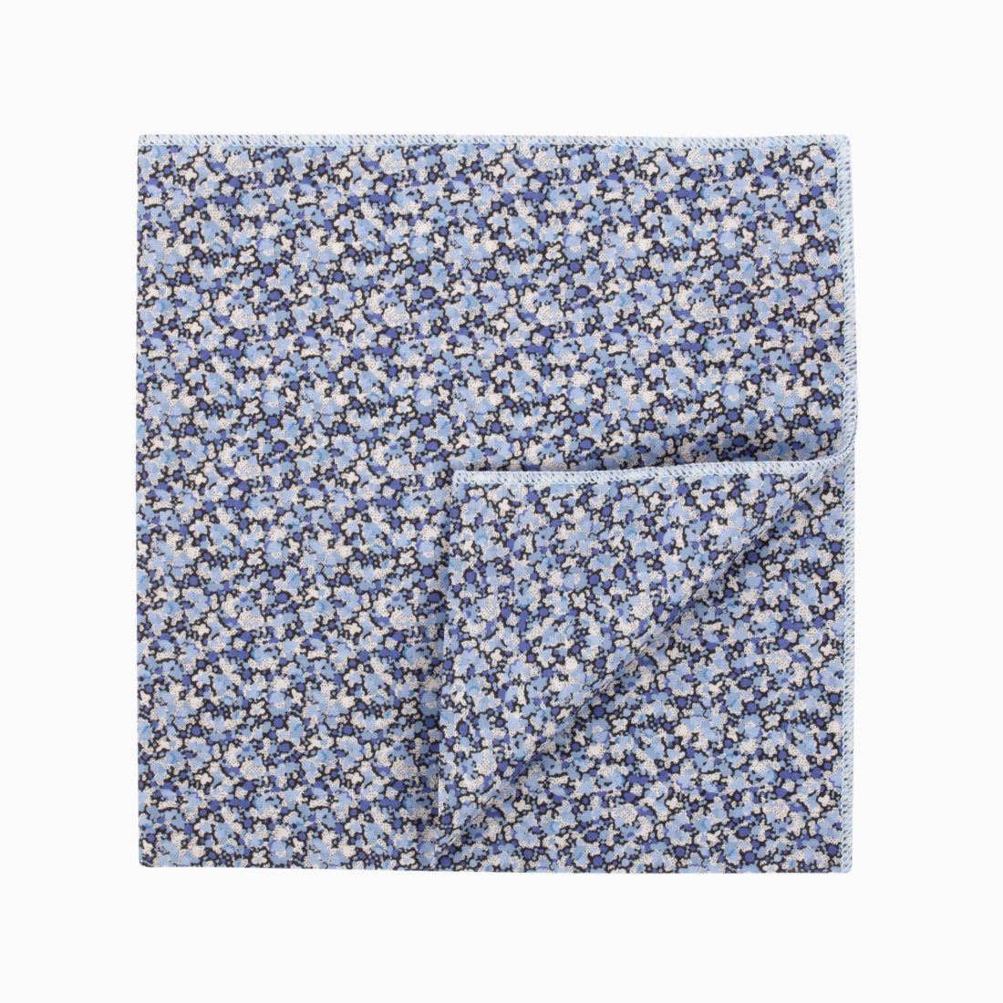 This pocket square features a floral pattern in shades of blue and white. The patterns resemble delicate small flowers, densely distributed across the surface. The various shades of blue, ranging from sky blue to navy, are harmoniously blended, offering a soothing and refreshing sensation. The pocket square gives an impression of elegance and subtlety, perfect for adding a discreet and refined touch to an outfit. It's ideal for formal events or occasions where you want to add a touch of color without being too bold.