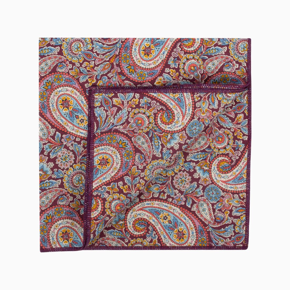 Make a style statement with this elegant pokcet square in fig Liberty Lee Manor fabric. Its intricately detailed paisley pattern blends deep shades of burgundy, blue and ochre, evoking a retro yet sophisticated charm. Perfect for enhancing a suit with a touch of refinement, it lends itself to all occasions, from weddings to formal events.
