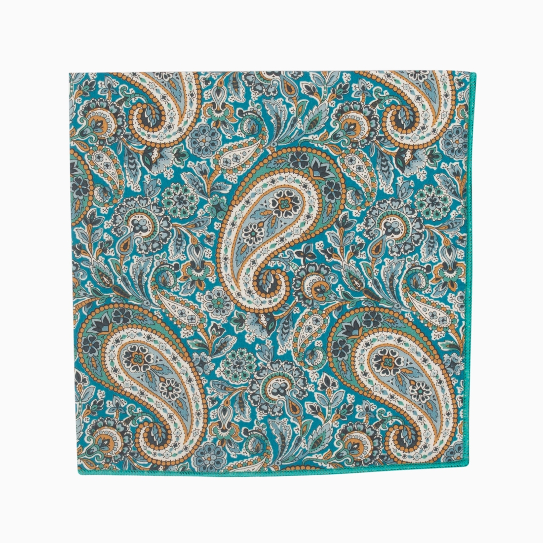 This pocket square features an intricate paisley design on a blue background. The patterns are accentuated by shades of turquoise, brown, and white, interwoven into a complex motif. The spiral shapes, typical of the paisley pattern, dominate the design, enriched by floral details and geometric motifs. The combination of these elements creates a sense of luxury and intrigue.