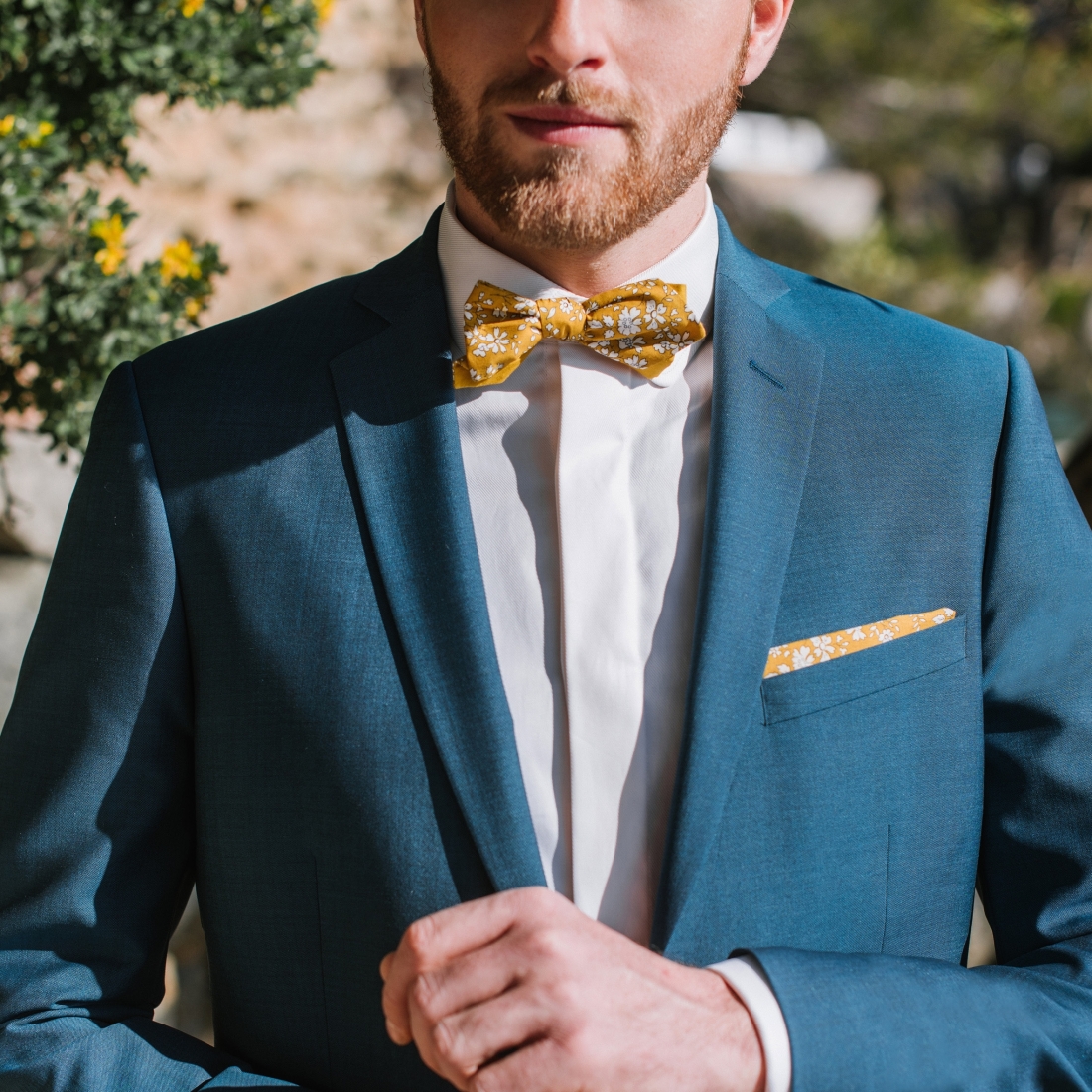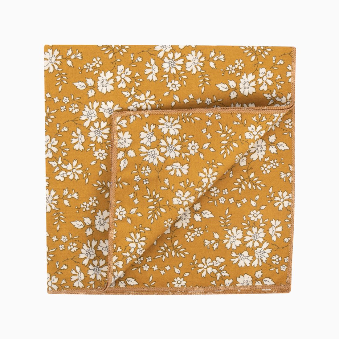 The presented pocket square features a distinctive Liberty Capel pattern on a mustard background. The pattern, composed of small white flowers and foliage, is delicate and finely detailed, contrasting beautifully with the bold and warm background. The mustard color adds an autumnal and sophisticated touch to the accessory. The edge of the pocket square is neat, reflecting a quality finish. It's an ideal choice for those looking to add an elegant touch and a pop of color to their outfit while maintaining a classic style.