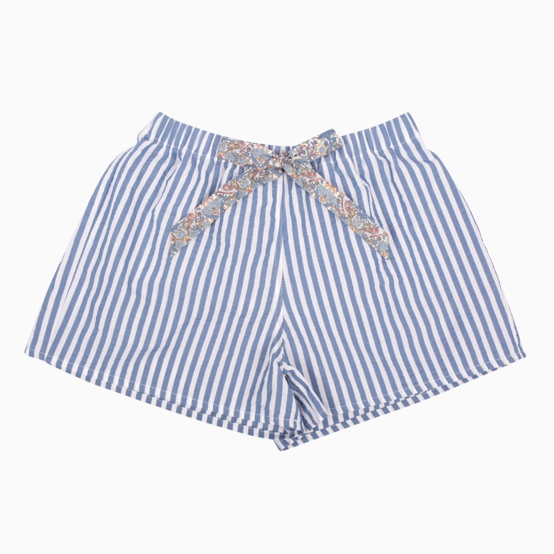 Experience comfort and laid-back style with this Blue Striped Seersucker Pyjama Short. The seersucker fabric, loved for its lightness and ability to keep heat at bay, features classic blue stripes reminiscent of seaside holidays. The blue-gray Liberty Strawberry Thief fabric drawstring adds an understated touch of elegance and refinement with its iconic pattern. This pyjama short is the perfect blend of functionality and traditional British aesthetic, ideal for summer nights or lounging at home.