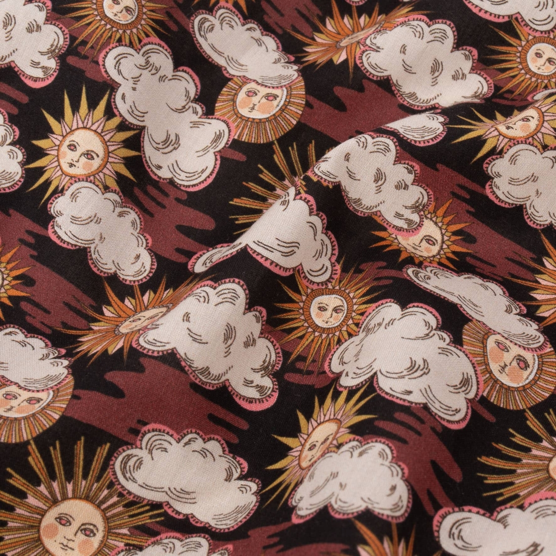 These pyjama shorts bring a piece of the sky to your nighttime wardrobe with their Follow the Sun pattern. Radiant sun faces and fluffy clouds stand out against a burgundy background, creating an atmosphere that is both dreamy and inspiring. A light pink silk ribbon to tighten the elastic waist provides a comfortable and feminine fit, perfect for serene nights of relaxation.