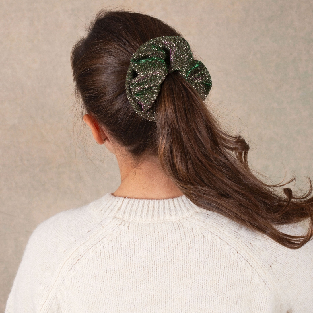 This scrunchie captures the essence of the disco era with its multicolored sequins that sparkle on a dark background. The glittering reflections of the sequins vary with the light, offering a dynamic color palette that evokes the festive atmosphere of the dance floor. This Disco Sequin scrunchie is perfect for adding a touch of joy and whimsy to any outfit, ideal for parties or for those looking to bring a bit of exuberance to their everyday life.