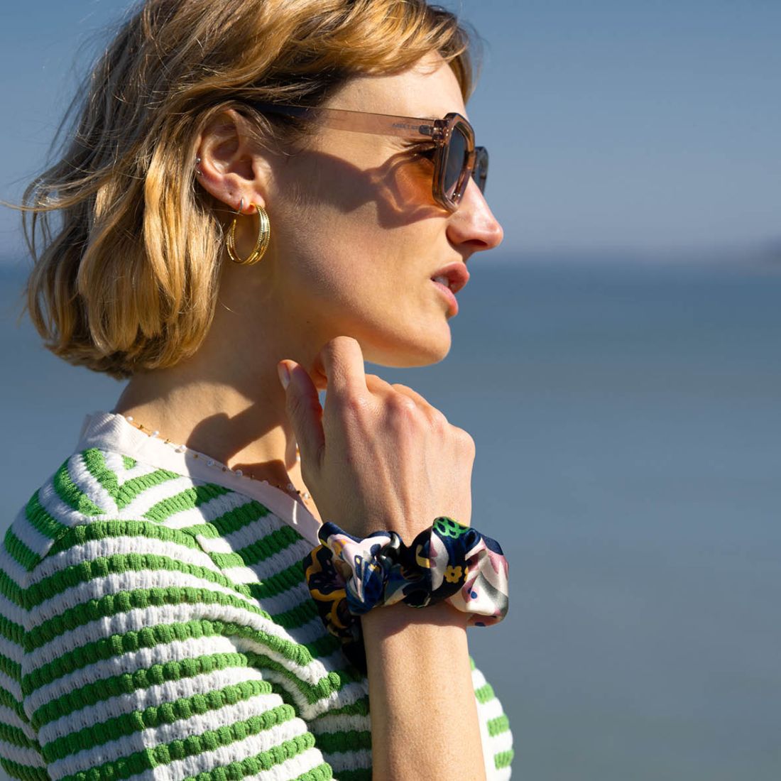 Elegance and refinement come together in this Liberty Floral Symphony silk scrunchie. Its midnight blue background highlights a sumptuous floral motif in delicate shades of pink, green and golden yellow. Made from pure silk, it adds a touch of softness and sophistication to your hairstyles, while preserving the hair fibre. An exceptional accessory for a distinguished, timeless look.