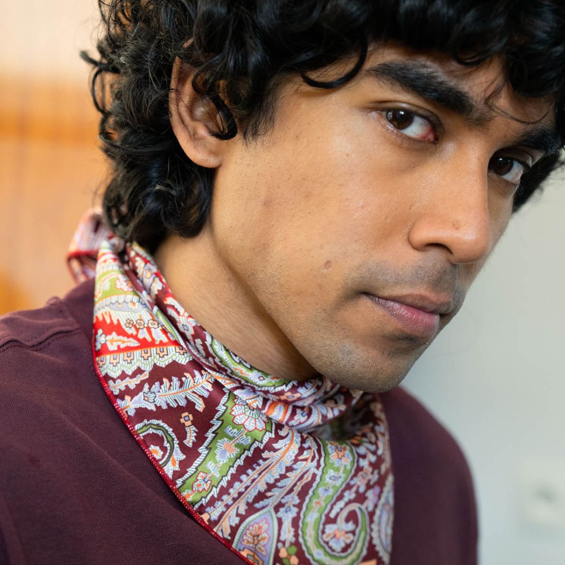 The vine-red Liberty Felix silk scarf is the perfect accessory for men seeking elegance and distinction. Made in Lille, it features a refined paisley pattern in deep red, shades of green and touches of orange and white, creating a subtle balance between tradition and modernity.
