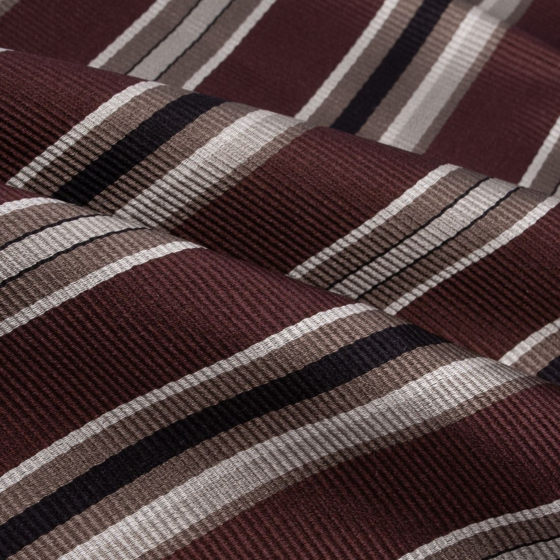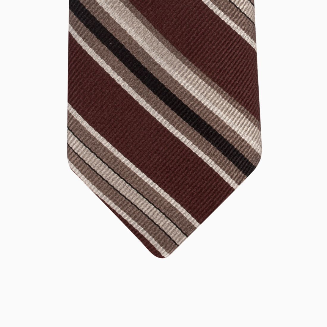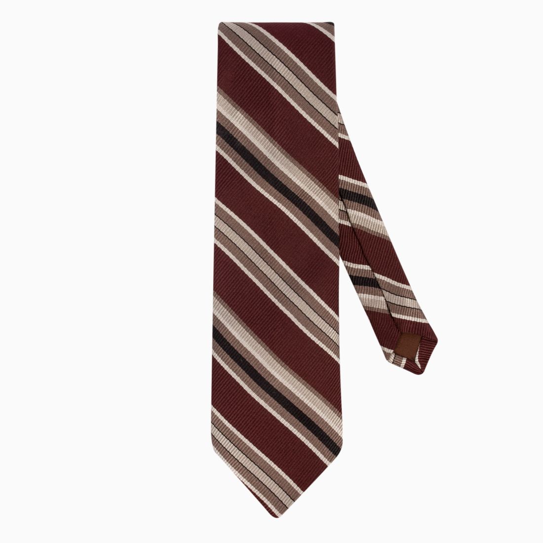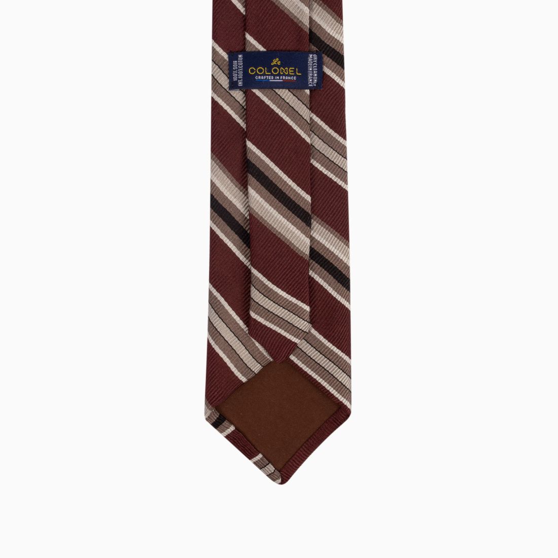This silk tie plays the neo-retro card with a bold blend of colors. Its brown base with reddish undertones is energized by graphic stripes in beige, 'café au lait', and black. The twill weave reinforces this vintage aesthetic, evoking 70s style codes. It is a trendy piece, ideal for adding depth to a suit and asserting a style that stands out from the crowd.