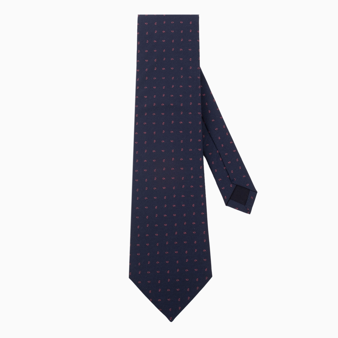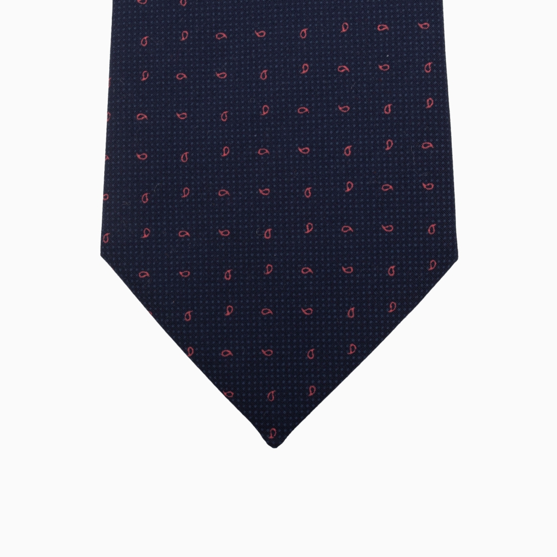 This tie stands out with its deep navy blue background, punctuated by small paisley-shaped motifs in a red hue. The patterns are evenly arranged, adding a subtle touch of elegance to the overall look. The dark background color contrasts beautifully with the red details, offering a harmonious palette. The intricacy of the paisley pattern, traditionally associated with elegance, gives this tie a character that is both classic and modern. Perfect for formal occasions or business meetings, this tie will add a refined note to any outfit.