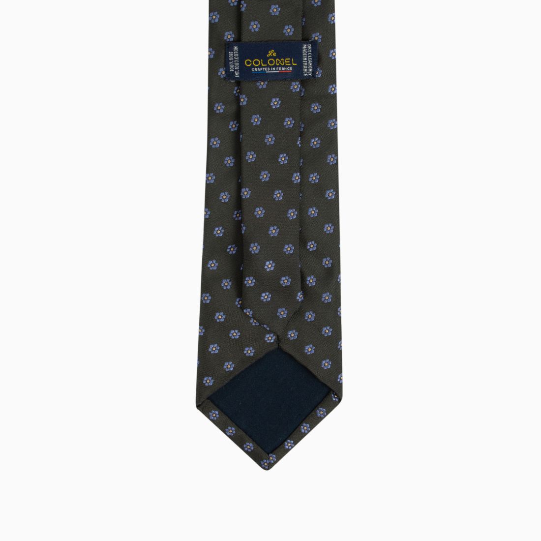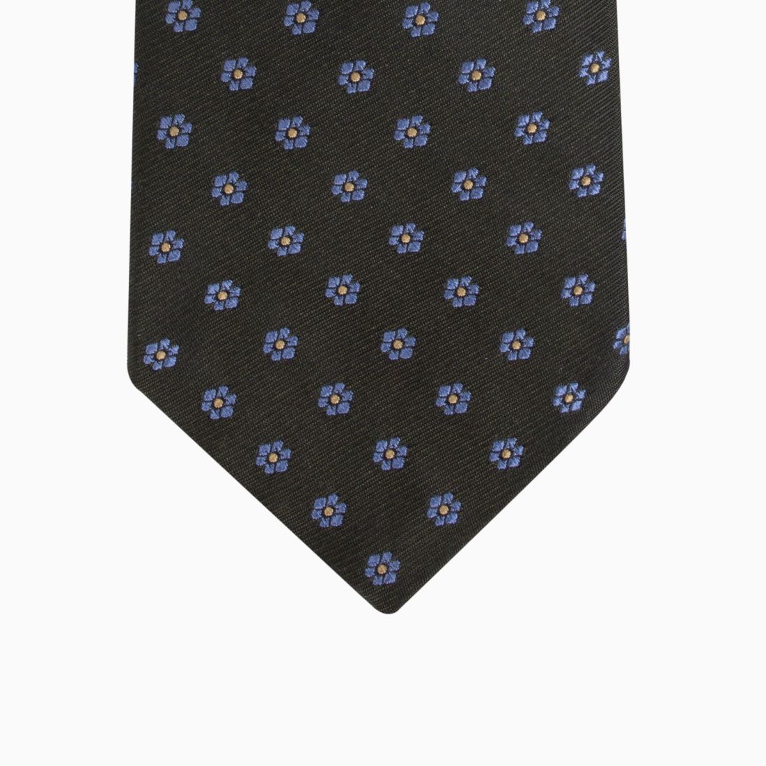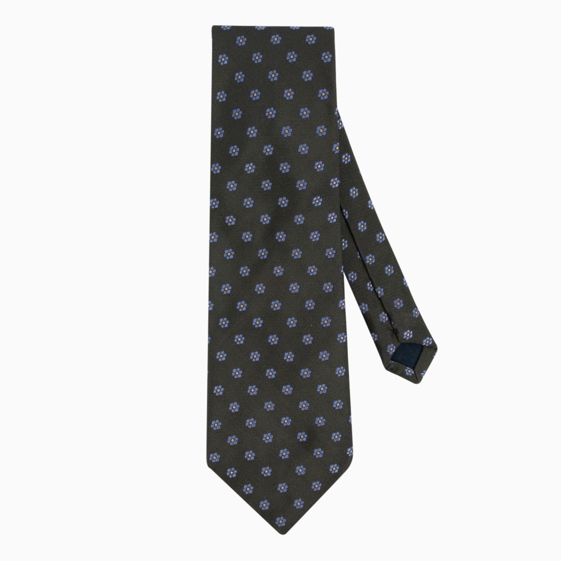 This Italian silk tie features a delicate geometric pattern where small stylized flowers with golden hearts illuminate a deep green background. The precision of the weave and the subtle contrast of colors bring a precious and structured dimension to the piece. Ideal for enhancing a navy blue or gray suit, it embodies a serene and sophisticated elegance, perfect for both a wedding and a prestigious meeting.