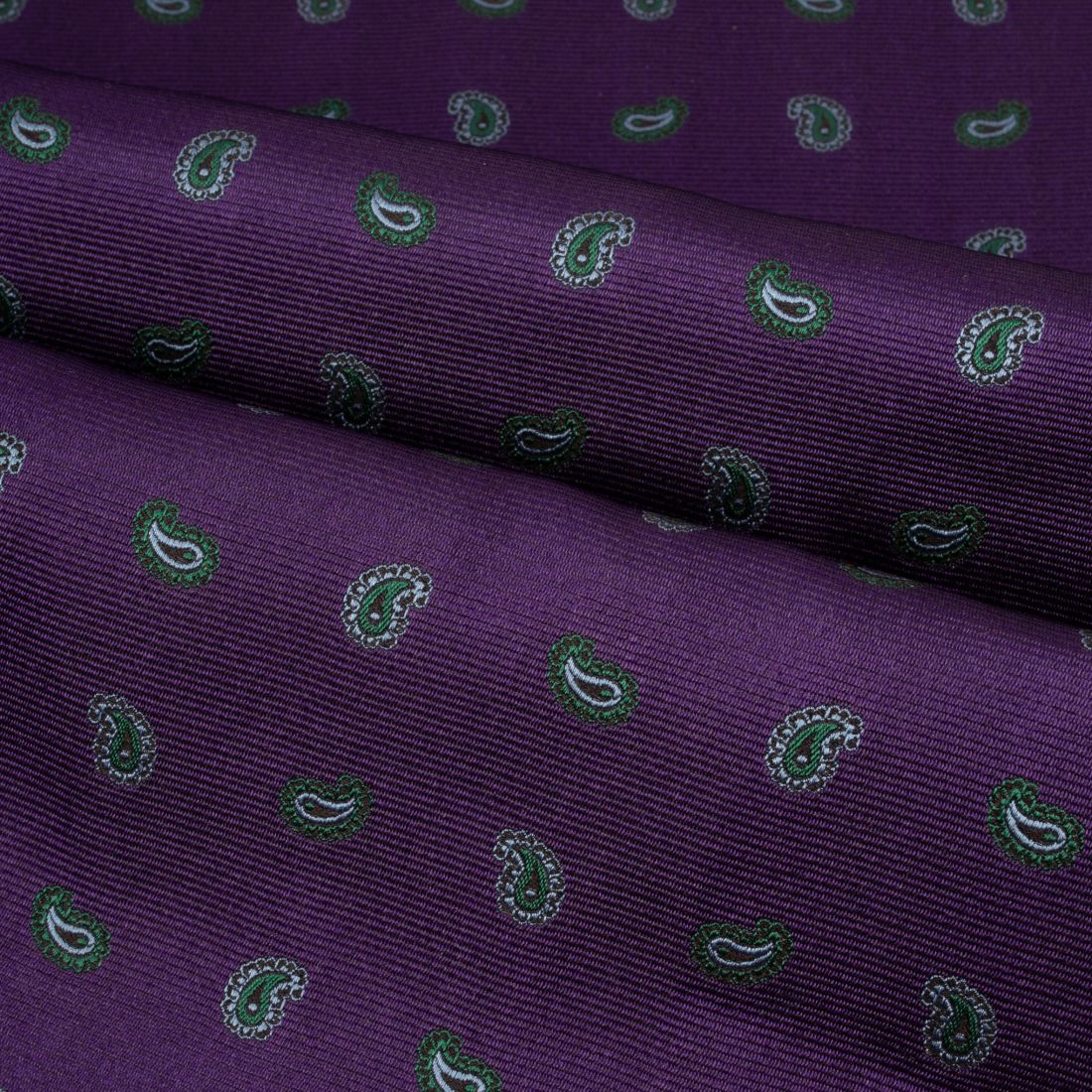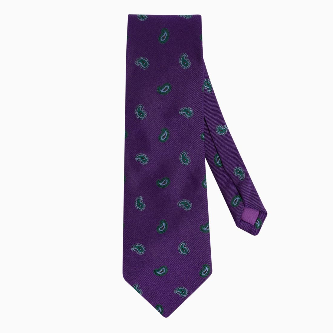 A flagship piece of your collection, the Duomo ultraviolet tie features a Paisley pattern on a vibrant purple background. The finely woven details in azure and green tones create a luminous contrast that enhances this Italian silk. Both bold and luxurious, it embodies a confident elegance for the man who wishes to assert his personality with refinement on grand occasions.