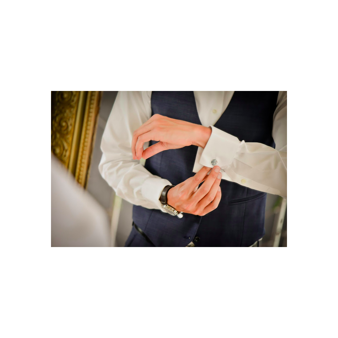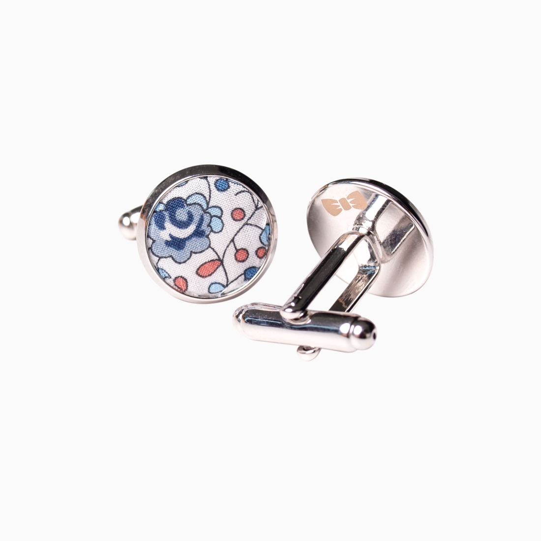 Ces boutons de manchette affichent un tissu finement travaillé, illustrant un motif floral élégant sur fond clair. Des fleurs d’un bleu profond s’y détachent, encadrées de délicats pétales roses et parsemées de petites touches de bleu plus clair. Ce bouquet textile est ponctué de feuilles vertes et de petites baies rougeâtres, ajoutant de la vie et de la diversité au design. La conception globale évoque un jardin anglais classique, avec un sens du détail et de la couleur qui apporte une touche sophistiquée et un charme discret à l’accessoire. Parfait pour rehausser une tenue avec subtilité et raffinement.
