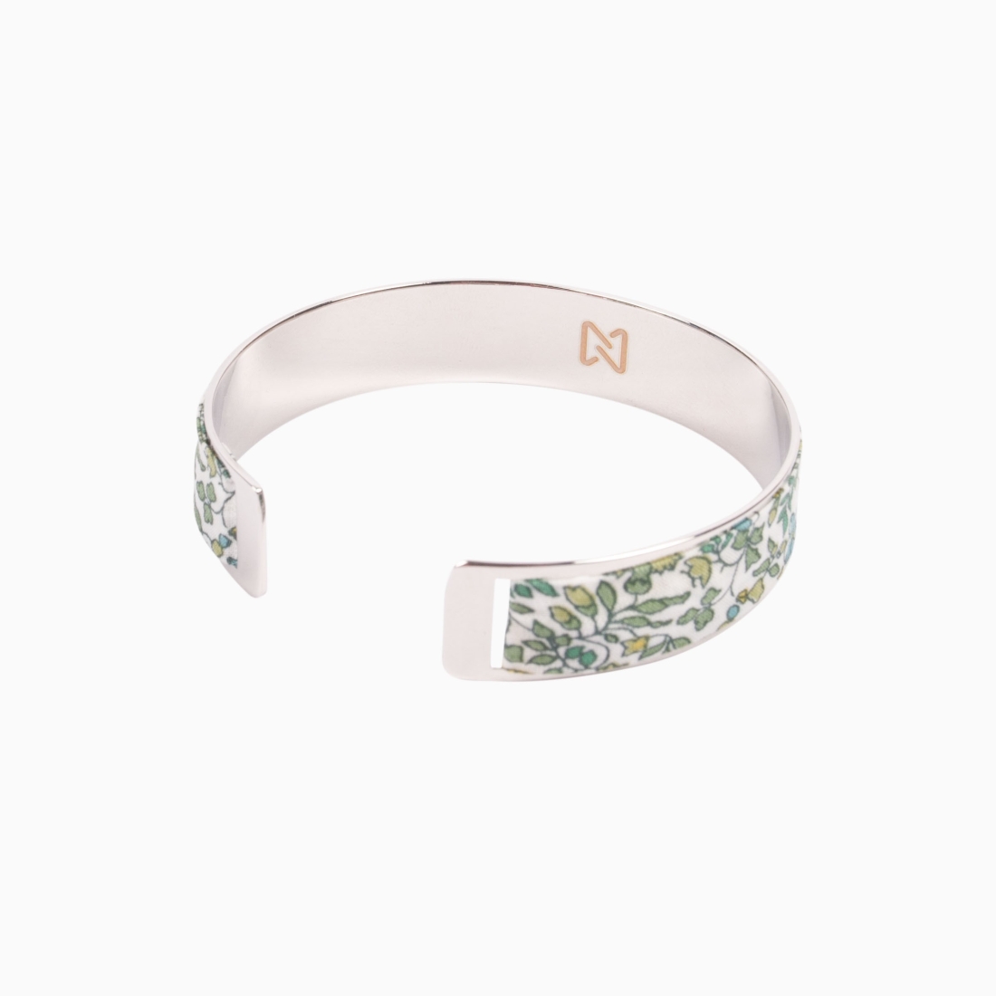 Le bracelet en laiton argenté affiche un motif floral délicat avec des fleurs dans des tons de vert et de jaune, éparpillées sur un fond blanc. Le design floral apporte une touche de printemps et de fraîcheur, et les couleurs claires suggèrent douceur et légèreté. La finition argentée du bracelet apporte une brillance discrète qui complète le motif sans l'éclipser. L'ouverture du bracelet est conçue pour un ajustement facile et confortable autour du poignet. Cet accessoire est parfait pour ceux qui aiment les motifs floraux subtils et souhaitent ajouter une touche élégante et naturelle à leur tenue.