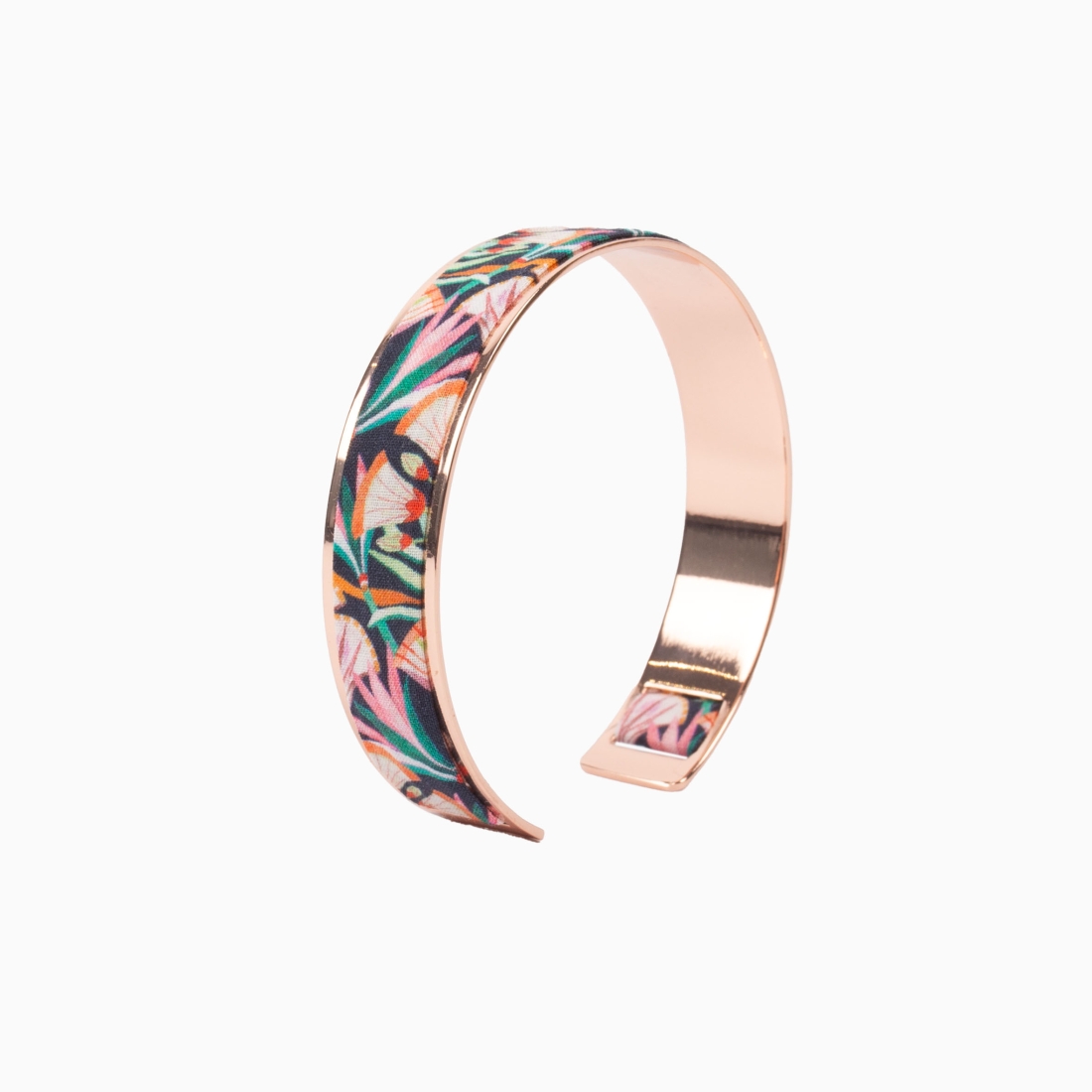 Ce bracelet en laiton argenté est orné du motif Liberty Lotus Lagon, où des fleurs exotiques s'épanouissent dans des teintes de vert et de rose sur un fond lagon enchanteur. La brillance de l'argenté contraste harmonieusement avec les couleurs vives du tissu, créant un accessoire qui capture l'essence d'un jardin aquatique. Parfait pour égayer une tenue avec une touche de couleur et d'élégance.