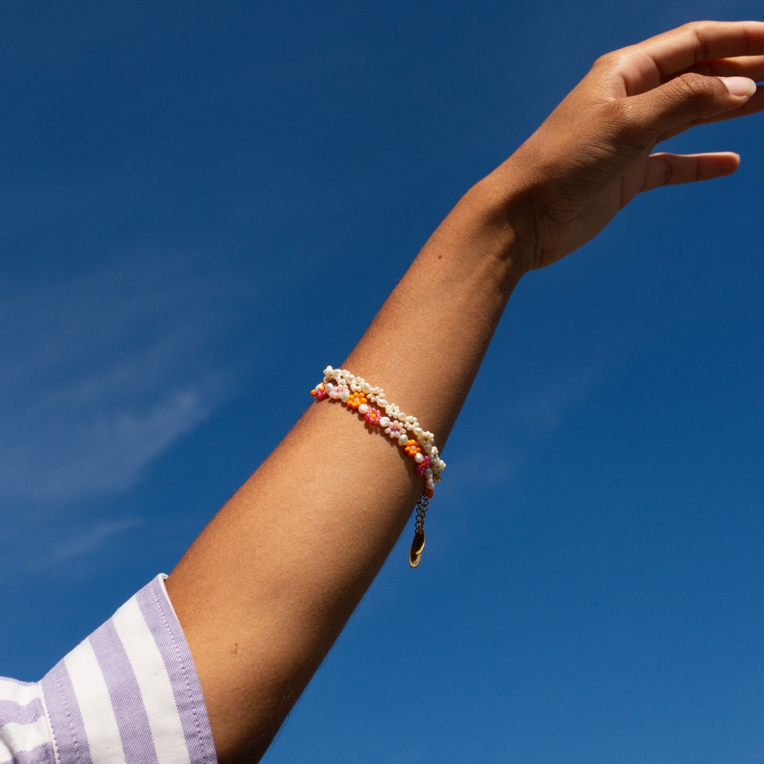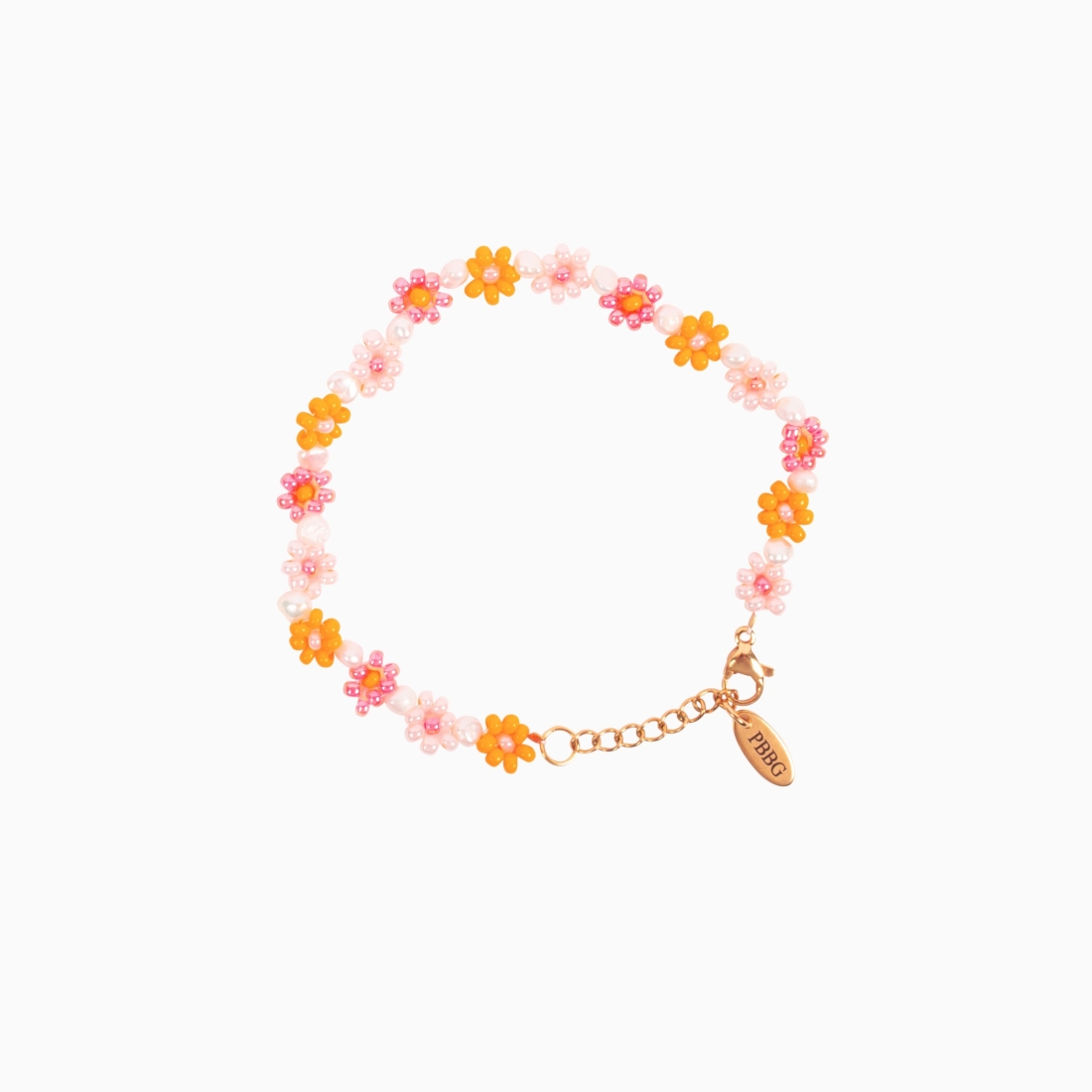 Ce bracelet ravissant de Pearls by Bianca est une cascade de teintes chaudes de coucher de soleil, avec des fleurs roses et oranges intercalées de perles lumineuses. Des détails dorés apportent une touche de brillance, et le bijou est sécurisé par un fermoir classique doré et une étiquette de marque signature. C'est un accessoire vibrant qui capture l'essence joyeuse d'un coucher de soleil en fleurs, parfait pour ajouter une touche de couleur à n'importe quelle tenue.
