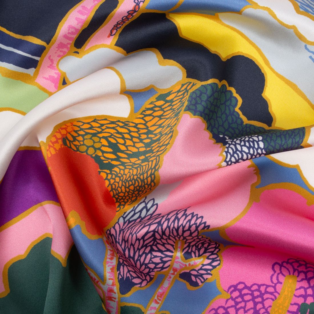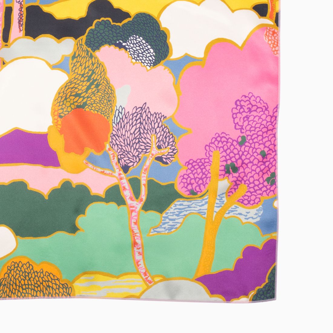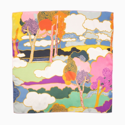 Le carré de soie Liberty Prospect Place cerisier est un accessoire raffiné qui apporte une touche d’originalité à votre style. Confectionné à Lille, il se distingue par un motif paysager captivant, où des arbres stylisés et des nuages se dessinent dans des nuances chaleureuses de rose, lilas et orange.