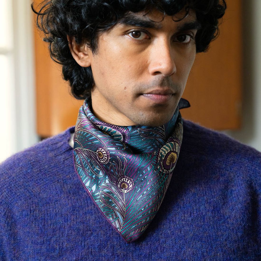 Le carré de soie Liberty Royal Hera se distingue par son motif majestueux inspiré des plumes de paon. Ses nuances profondes de violet, bleu et or lui confèrent une allure raffinée et audacieuse.