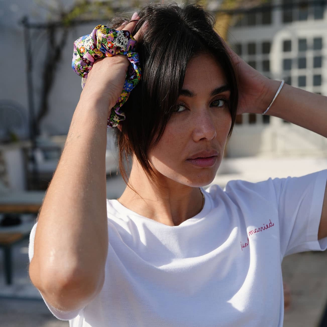 Ce chouchou en soie représente un petit luxe quotidien. Avec son tissu Liberty orné du motif Thorpeness lilas, il tient les cheveux avec douceur sans les abîmer, tout en ajoutant une touche d'élégance florale intemporelle à votre coiffure.