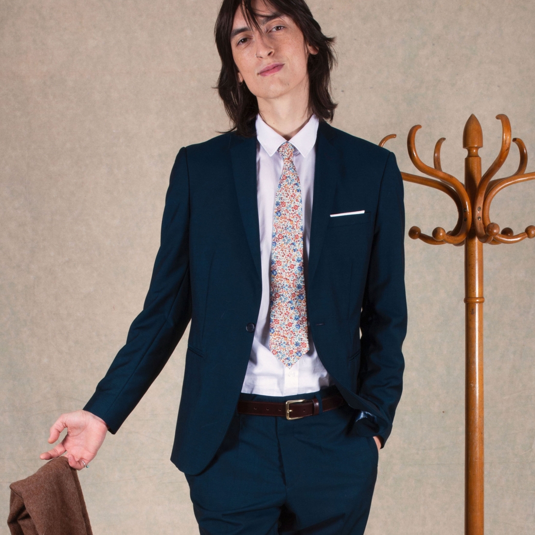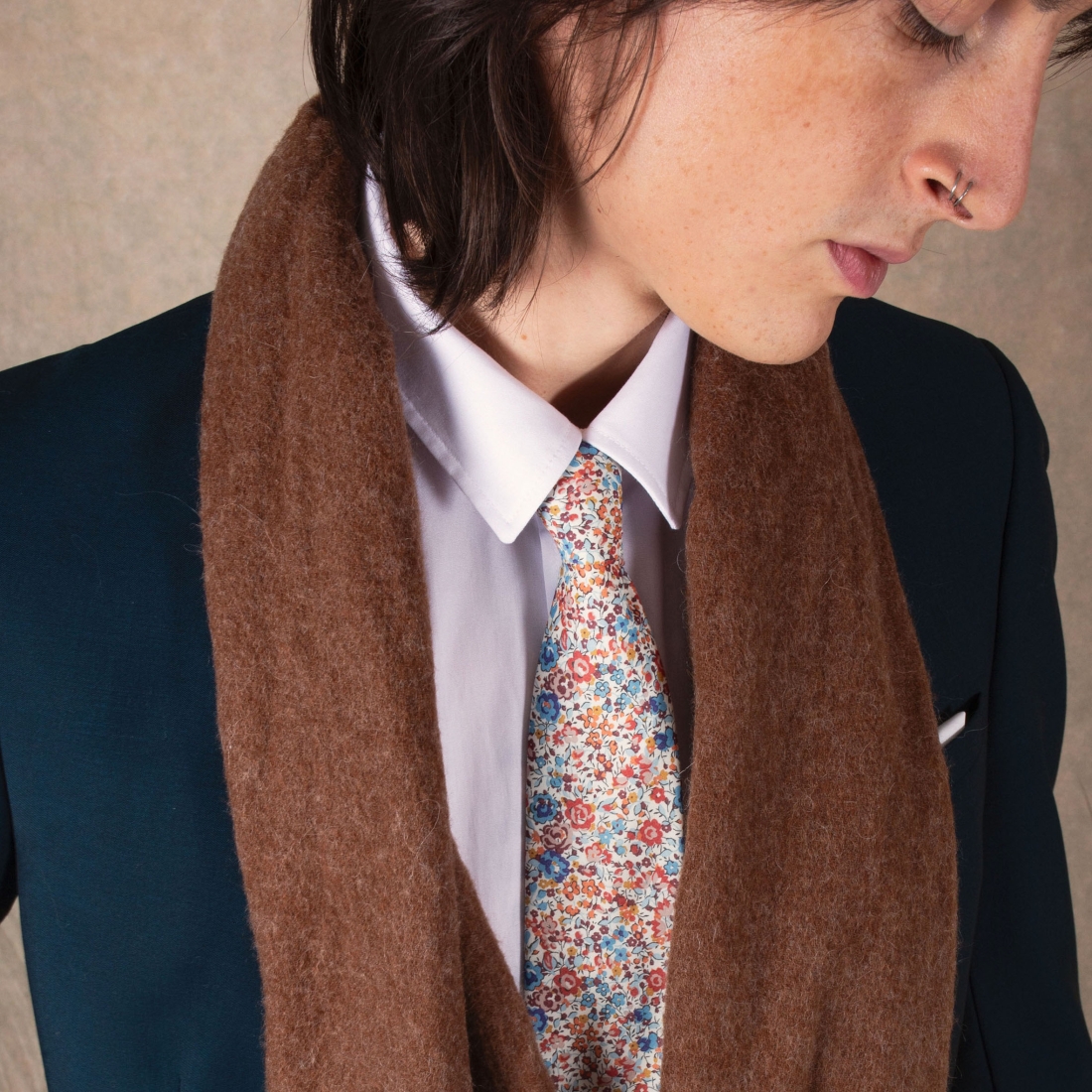Cette cravate présente un design floral exquis, avec une profusion de fleurs aux couleurs vives qui s'épanouissent sur un fond clair. Les nuances de brique, bleu, orange et brun se mêlent harmonieusement, créant une symphonie de couleurs. L'agencement des motifs donne l'impression d'un jardin en pleine floraison, capturant l'essence des journées ensoleillées. En plus d'être esthétiquement plaisant, ce motif floral apporte une touche de gaieté et de sophistication.