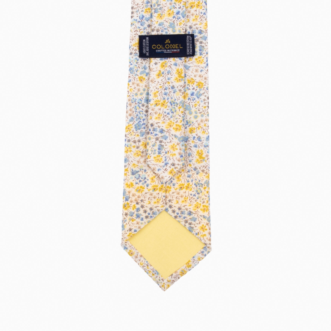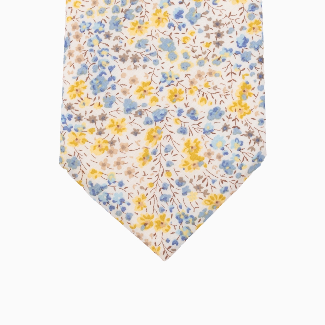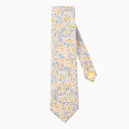 Cette cravate présente un motif floral délicat avec des fleurs en nuances de bleu, moutarde et gris sur un fond clair. La combinaison des teintes douces avec les touches plus vives de moutarde et de bleu rend cette cravate polyvalente, pouvant être portée dans un contexte professionnel ou lors d'occasions plus décontractées.