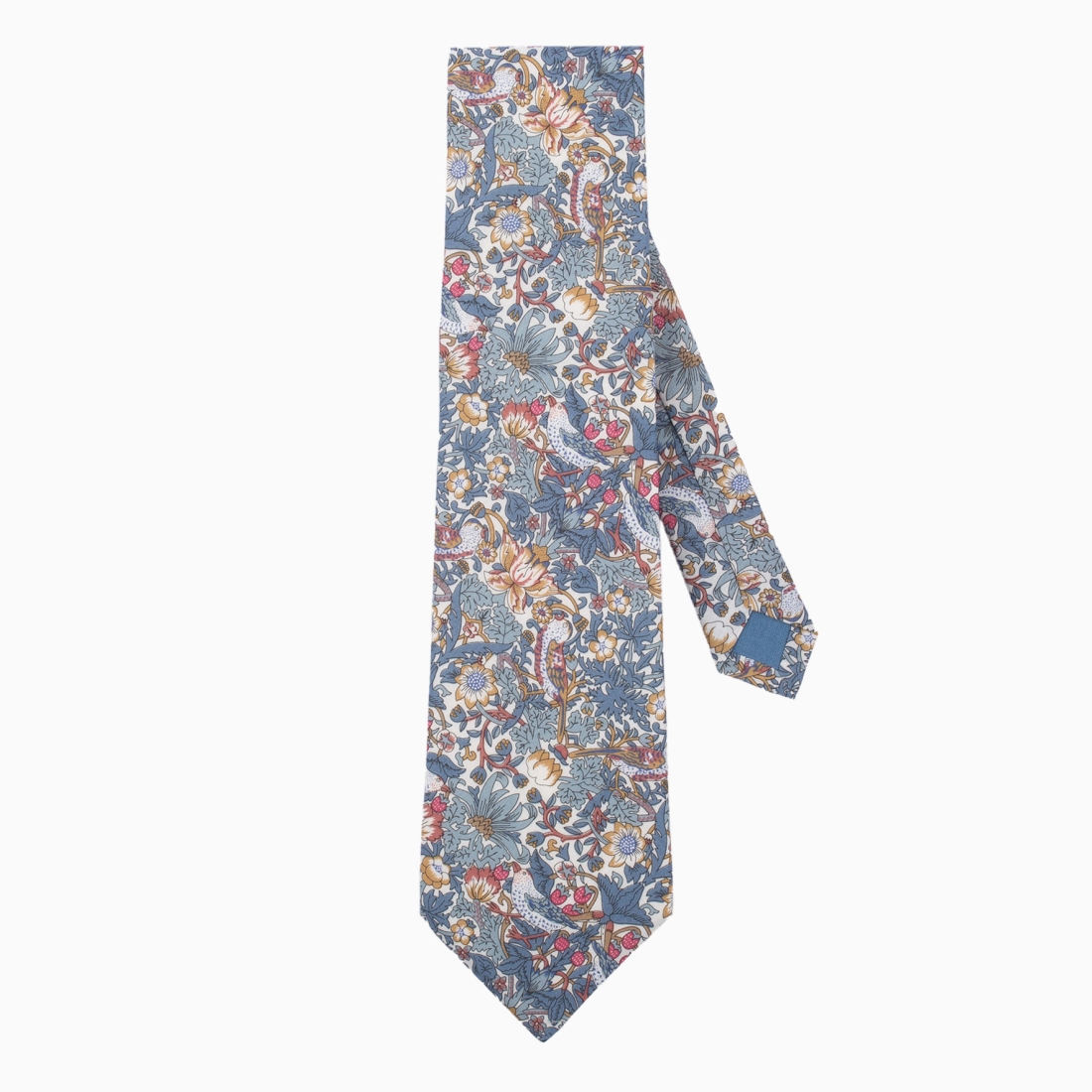 Cette cravate est ornée d'un design riche et détaillé, mêlant motifs floraux et fauniques. Les nuances subtiles de bleu, rose, doré et blanc créent un équilibre harmonieux. Les oiseaux et les fraises intégrés au motif apportent une touche de vivacité et d'originalité. Les motifs entrelacés et les détails minutieux donnent une impression de luxe et d'artisanat raffiné. Cette cravate serait parfaite pour une occasion spéciale ou pour quiconque souhaite ajouter une pièce maîtresse à sa tenue, reflétant une appréciation pour les designs artistiques et élaborés.
