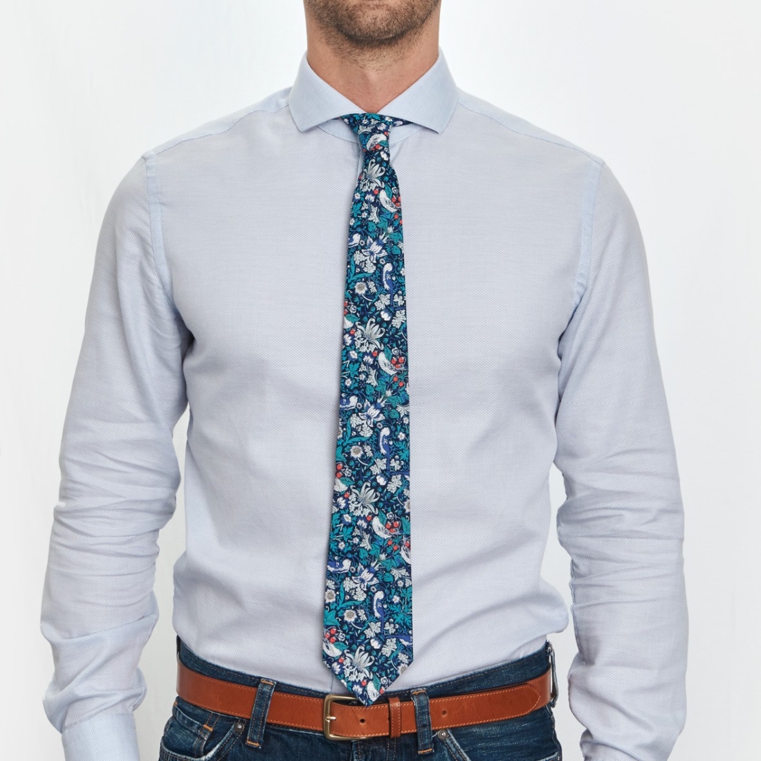 Cette cravate présente un motif riche et détaillé sur un fond bleu profond. Les motifs floraux en nuances de bleu et blanc se mêlent harmonieusement, créant un contraste subtil avec le fond. Les fraises ajoutent une touche ludique et contrastante. De délicats oiseaux, parés de plumes bleues et blanches, se perchent parmi les fleurs, ajoutant une dimension narrative au design. L'ensemble donne une impression de jardin enchanté.