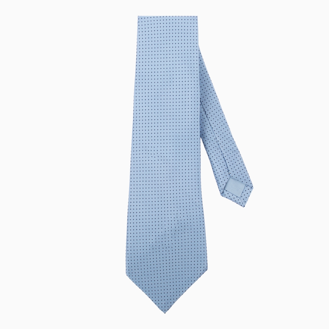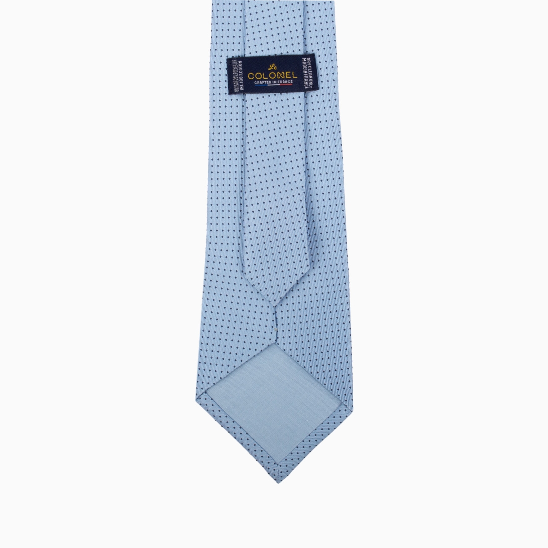 Cette cravate en soie affiche une teinte bleu clair délicate, agrémentée de petits motifs ponctuels sombres, offrant une texture subtile. La finition lustrée de la soie lui confère une élégance raffinée. Son design simple, mais distingué, la rend adaptée à la fois pour des occasions formelles et des moments moins formels.