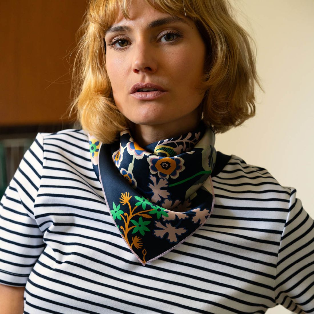 Le carré de soie Liberty Floral Symphony allie caractère et élégance avec son motif floral aux teintes harmonieuses. Sur un fond bleu marine profond, de grandes fleurs et feuillages verts, ross et kaki créent un contraste subtil et raffiné.