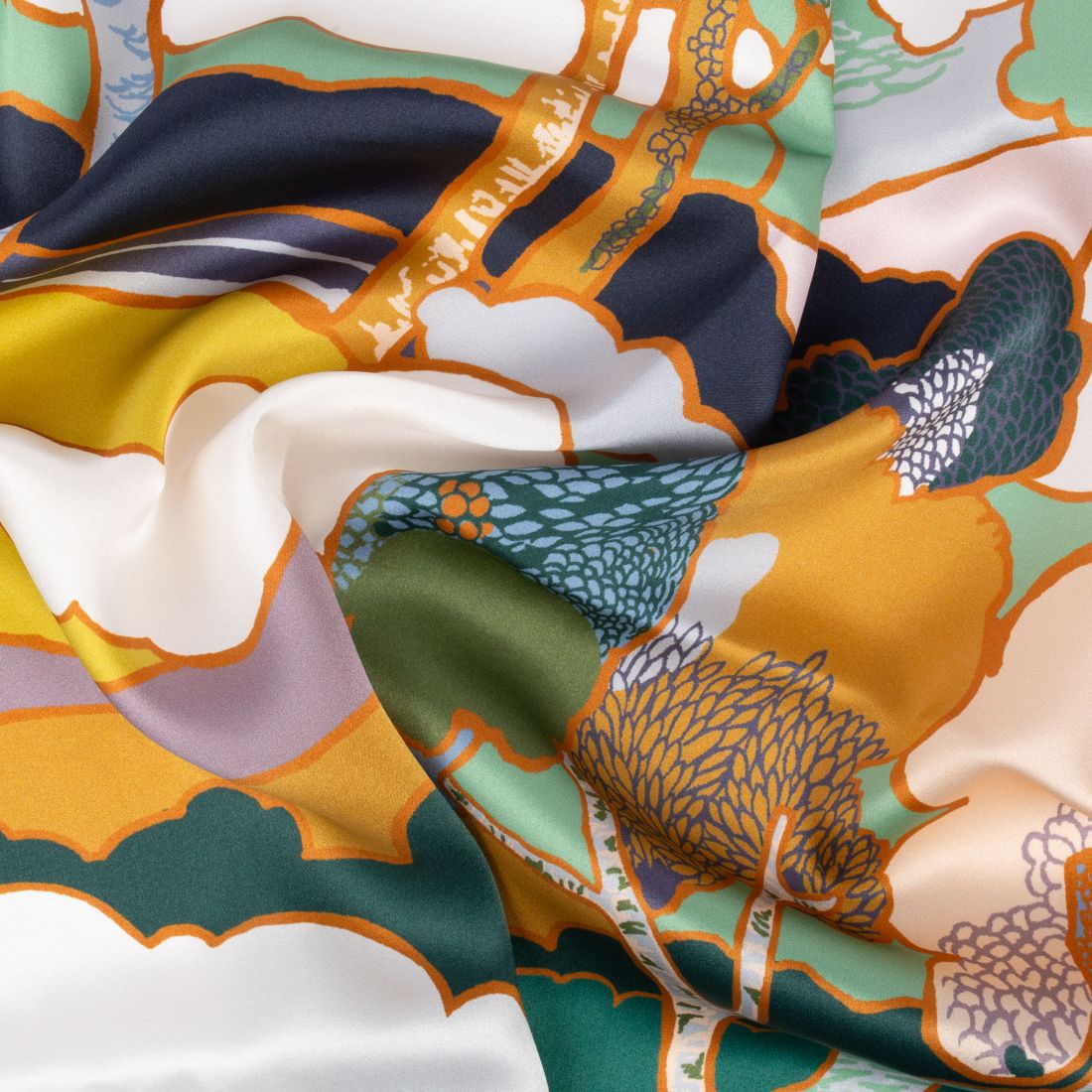Le carré de soie Liberty Prospect Place bonsaï est une véritable œuvre d’art textile, confectionnée avec soin à Lille. Son motif enchanteur évoque un paysage onirique où arbres stylisés et nuages flottent dans une harmonie de verts, de bleus et de touches dorées. Son jeu de couleurs audacieux et sa fluidité exquise en font un accessoire d’exception.