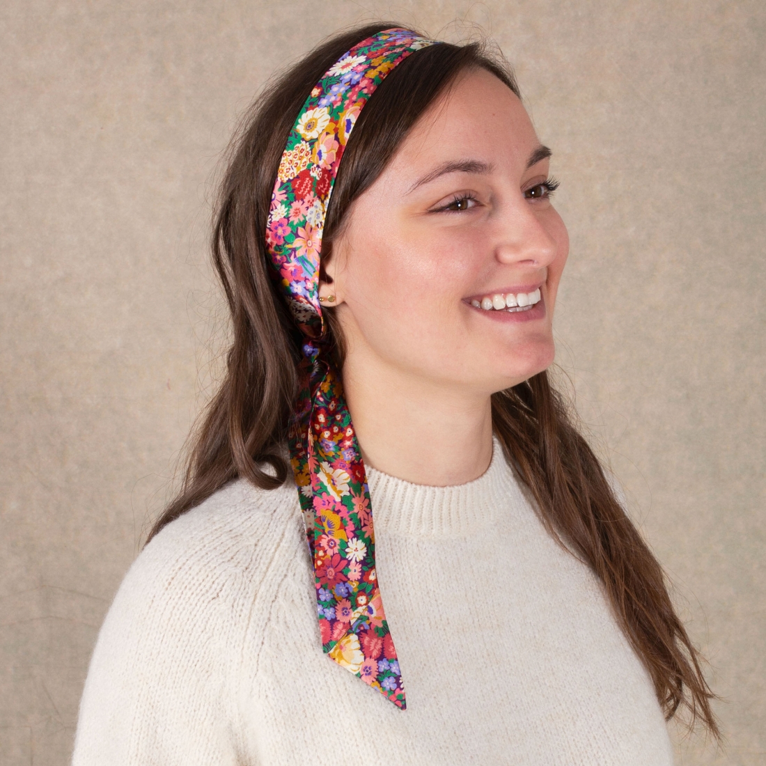 Ce foulard met en avant son motif floral vibrant et coloré qui ajoute une touche de vivacité à l'apparence de la personne. L'éventail riche en couleurs et la densité des fleurs confèrent un aspect à la fois ludique et à la mode. Ce foulard, affectueusement nommé Lili, est d'une polyvalence exceptionnelle. Il peut être noué avec style autour de la anse d'un sac, apportant une explosion de couleur et de personnalité à un article de tous les jours. Porté autour du cou, il peut agir comme une pièce maîtresse, attirant l'attention et complétant la tenue. Alternativement, attaché autour de la taille comme une ceinture, il peut resserrer les vêtements pour une silhouette plus définie. Qu'il soit utilisé comme accessoire pour les cheveux, un charm pour sac, un foulard ou une ceinture, le foulard Lili est un élément adaptable qui peut rehausser une gamme de looks.