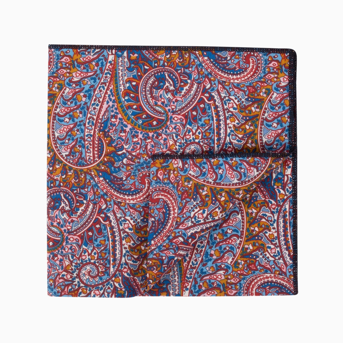 Ce carré est orné d'un motif paisley complexe, mêlant des teintes de bleu, de rouge et d'orange. Les motifs en spirale s'entrelacent avec des détails fins, rappelant les designs traditionnels indiens ou persans. Les bordures incorporant des motifs géométriques ajoutent une dimension supplémentaire à ce design riche. Les touches de blanc éclatant créent un contraste saisissant, faisant ressortir chaque détail. L'ensemble évoque une sensation d'exotisme et de mystère, parfait pour ceux qui cherchent à ajouter une touche d'élégance et de sophistication à leur garde-robe.