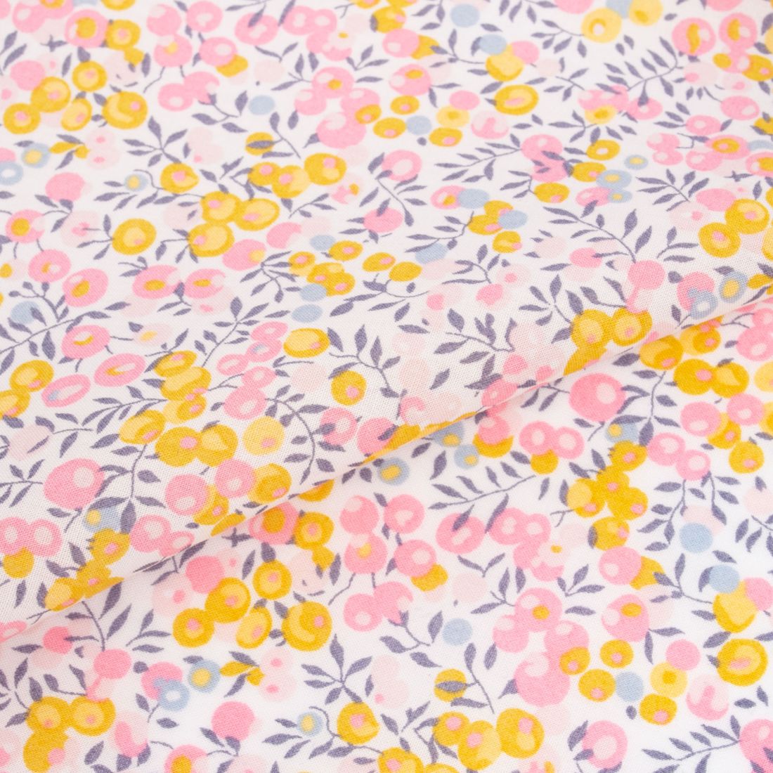 Ce motif floral présente une harmonie de couleurs vibrantes et joyeuses, avec des nuances de rose, d'orange et de jaune. Ces teintes vives sont équilibrées par des touches de bleu et de gris, apportant une profondeur à l'ensemble. Le dessin est constitué d'une multitude de petites fleurs et de feuilles, créant un effet de densité et de richesse. La répartition des éléments donne une impression d'abondance et d'énergie. Cette étoffe évoque la chaleur de l'été, les jardins en fleurs et la joie des journées ensoleillées. Elle apporterait une touche lumineuse et pétillante à une tenue, tout en restant élégante grâce à la finesse des détails.